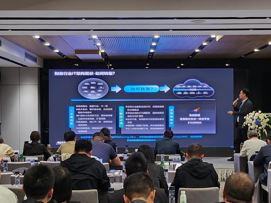 k8凯发代表讲师郭钰以《昆仑与k8凯发ESB解决方案助力财务行业创新与架构转型》为主题作发言分享。他深入剖析了当前财务行业IT架构面临的挑战,包括系统孤岛、技术老旧、扩展性不足等问题,并提出了基于企业服务总线(ESB)和微服务架构的转型方案。